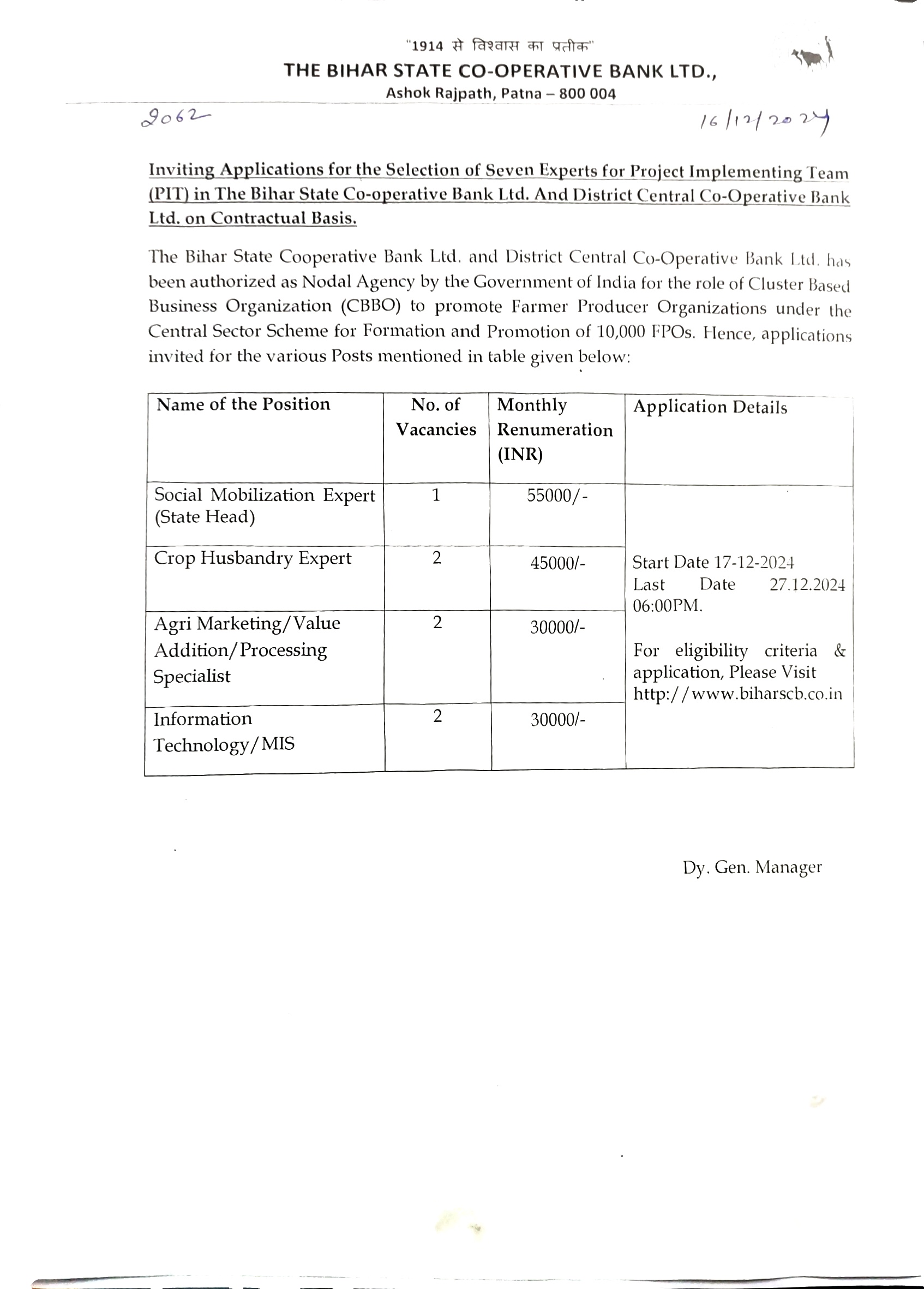 Notice Regarding Application Form for the Selection of Seven Experts in Project Implementing Team in The Bihar State Co-operative Bank Ltd.& DCCB’s Click Here to download detailed Advertisement. Click Here to download Notice. Click Here to download Application Form. Click Here to download detailed Revised Advertisement. Click Here to download Revised Notice. Click Here to download Revised Application Form. Click Here to download Notice regarding Date Extension. 17.12.2024 06.01.2025