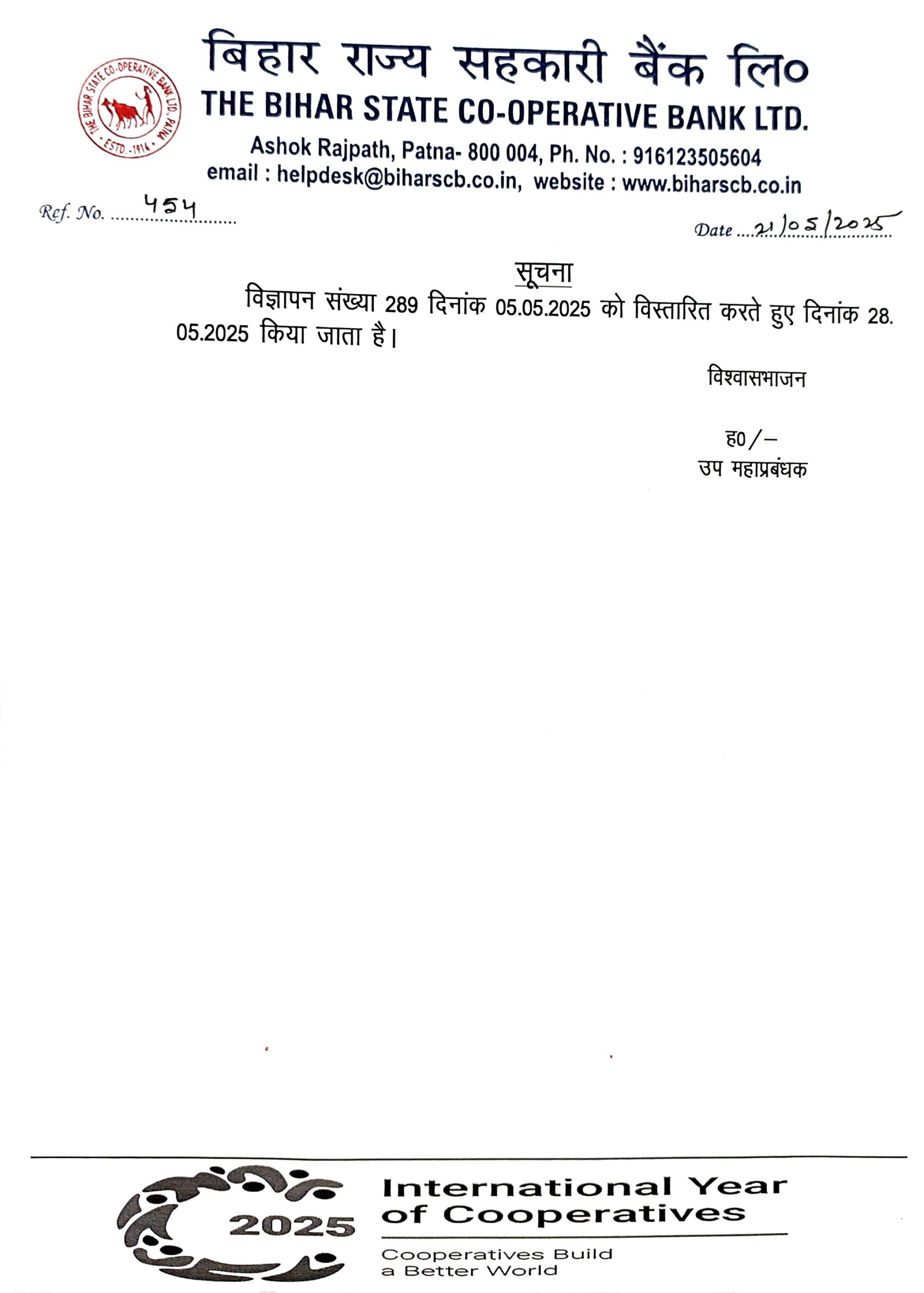 Notice Regarding Application Form for Chief Risk Officer on Contract Basis in The Bihar State Co-operative Bank Ltd. Click Here to download detailed Advertisement. Click Here to download Notice. Click Here to download Application Form. Click Here to download Date extension Notice. Click Here to download Date extension Notice. 22.12.2024 15.02.2025