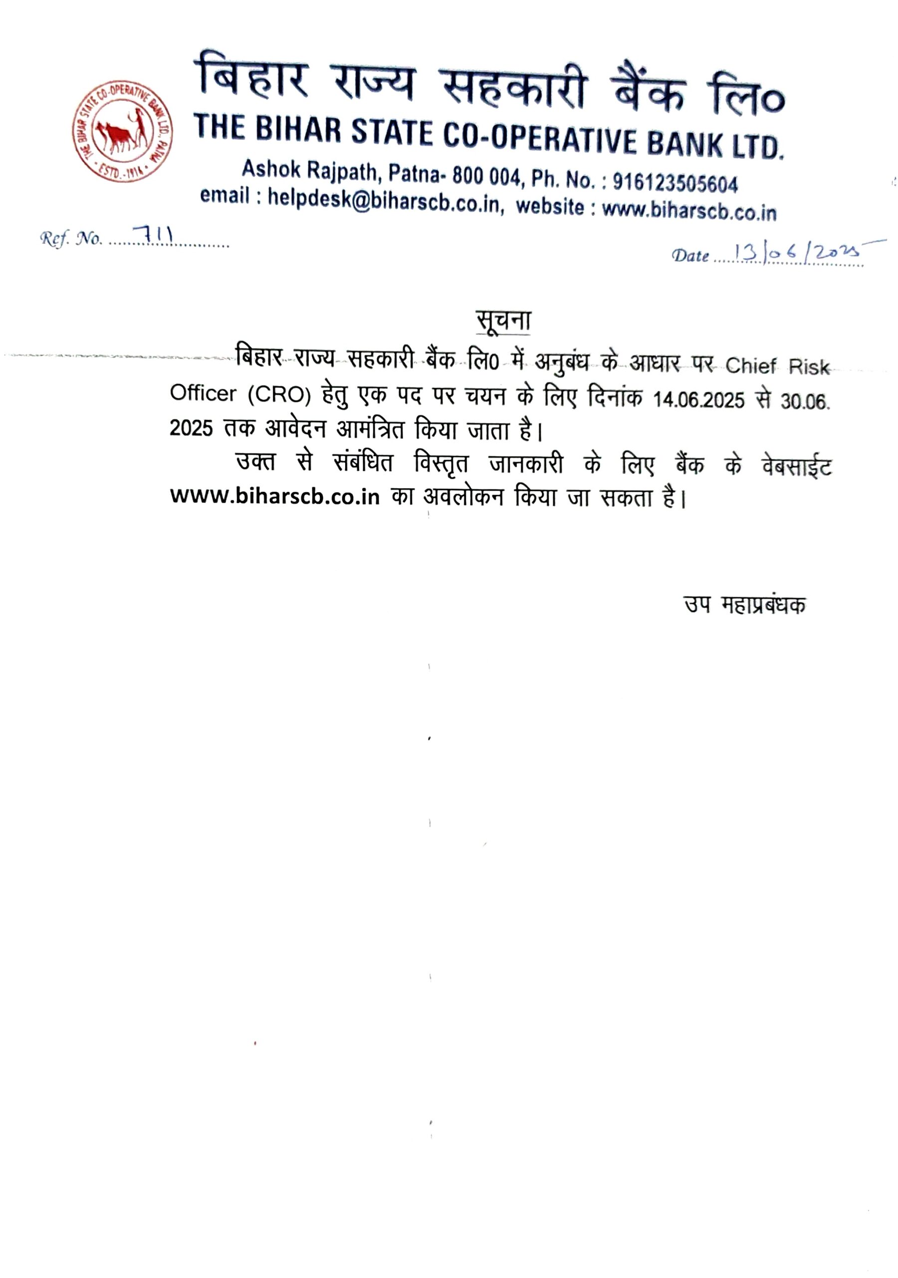 Notice Regarding Application Form for Chief Risk Officer on Contract Basis in The Bihar State Co-operative Bank Ltd. Click Here to download detailed Advertisement. Click Here to download Notice. Click Here to download Application Form. 14.06.2025 30.06.2025