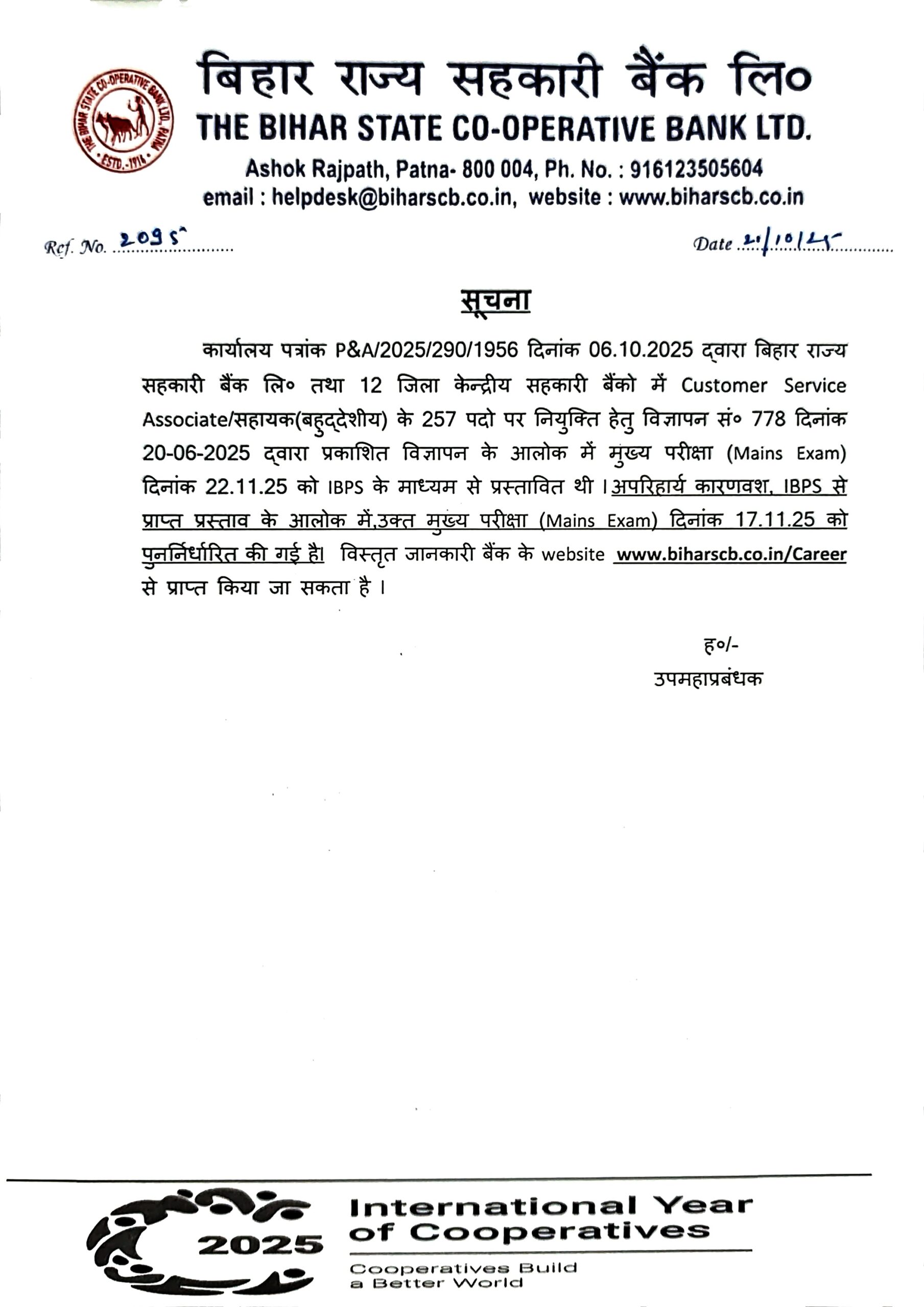 Recruitment for the post of Customer Service Associate (CSA)/ Assistant (Multipurpose) in The Bihar State Co-operative Bank Ltd. and 12 DCCB’s by IBPS. Click Here to Download Notice. Click Here to Download Advertisement. Click Here to Apply Online. Click Here to view CSA/ Assistant Corrigendum Notice. Click Here to download notice regarding exam date. Click Here to download Information Handout in Hindi. Click Here to download Information Handout in English. Click Here to download Admit Card. Click Here to download Notice regarding Amendment in Advertisement. Click Here to download Cutoff List. Click Here to download result of Candidates Passed in PRELIMINARY EXAM. Click Here to download information regarding Main Exam Date. Click Here to download updated information regarding Mains Exam Date. Click Here to view score card of Prelims Exam conducted on 31.08.2025. Click Here to download Admit Card for Mains Exam. Click Here to download Information Handout in Hindi. Click Here to download Information Handout in English. Click Here to download notice regarding seat increase in Gopalganj DCCB. 21.06.2025 10.07.2025